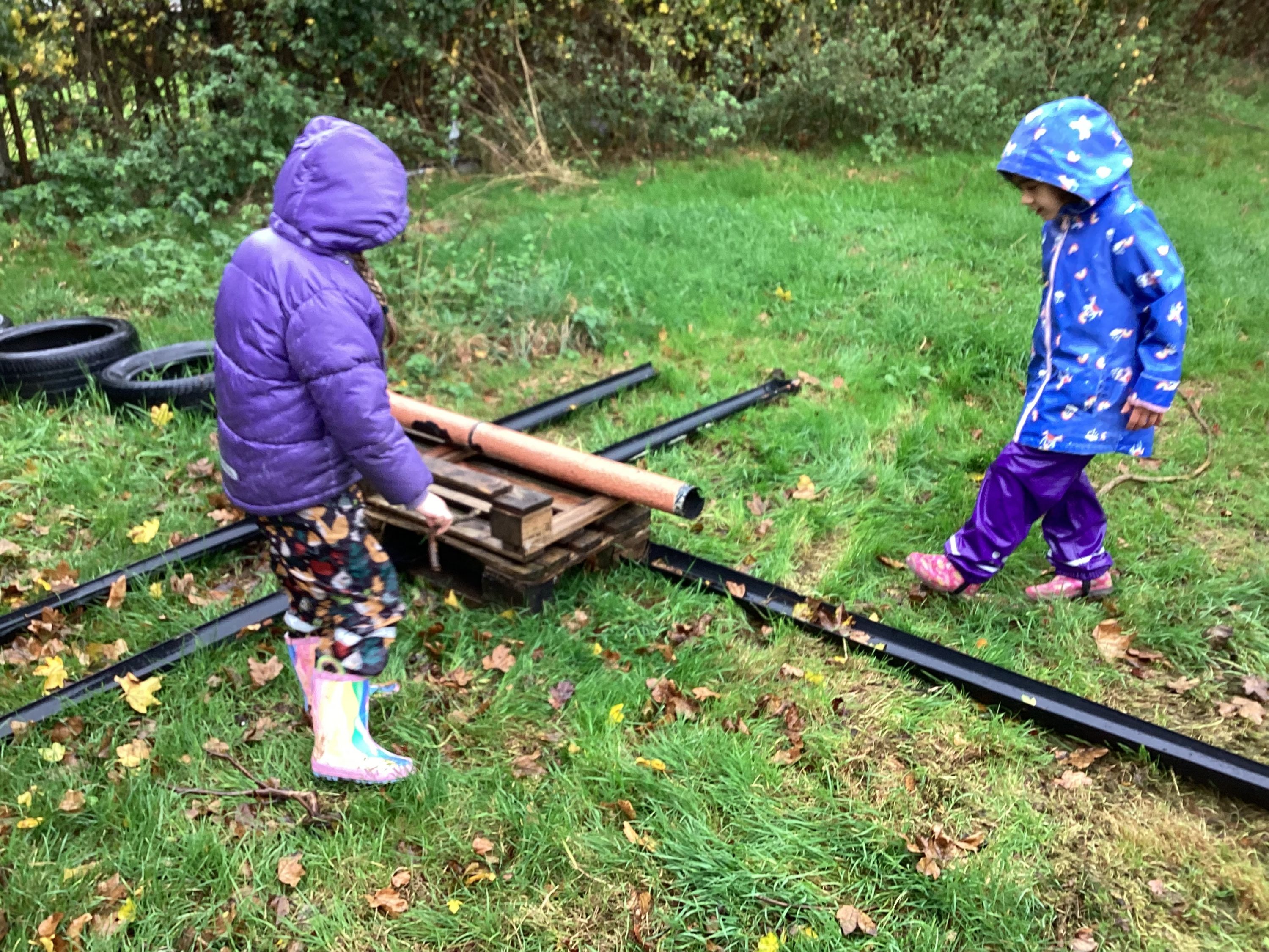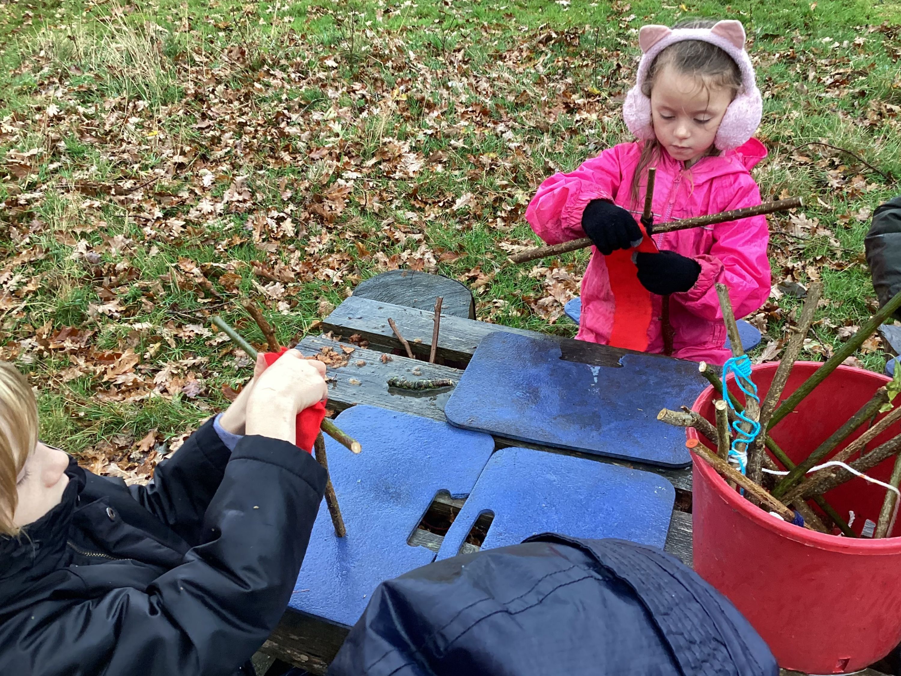 Despite the rainy weather at Forest School today, we had a fantastic time! The children made the most of the wet conditions by transforming our mud area into a busy construction site, using a variety of construction vehicles in their play. We also created beautiful poppies using wool, felt, and sticks — the results were stunning, and the children learned how to tie a clove hitch knot as part of the activity. Zanthe and Georgia worked hard to build an impressive bug hotel, and we had plenty of enthusiastic helpers cutting shrubs and contributing to the day’s projects.