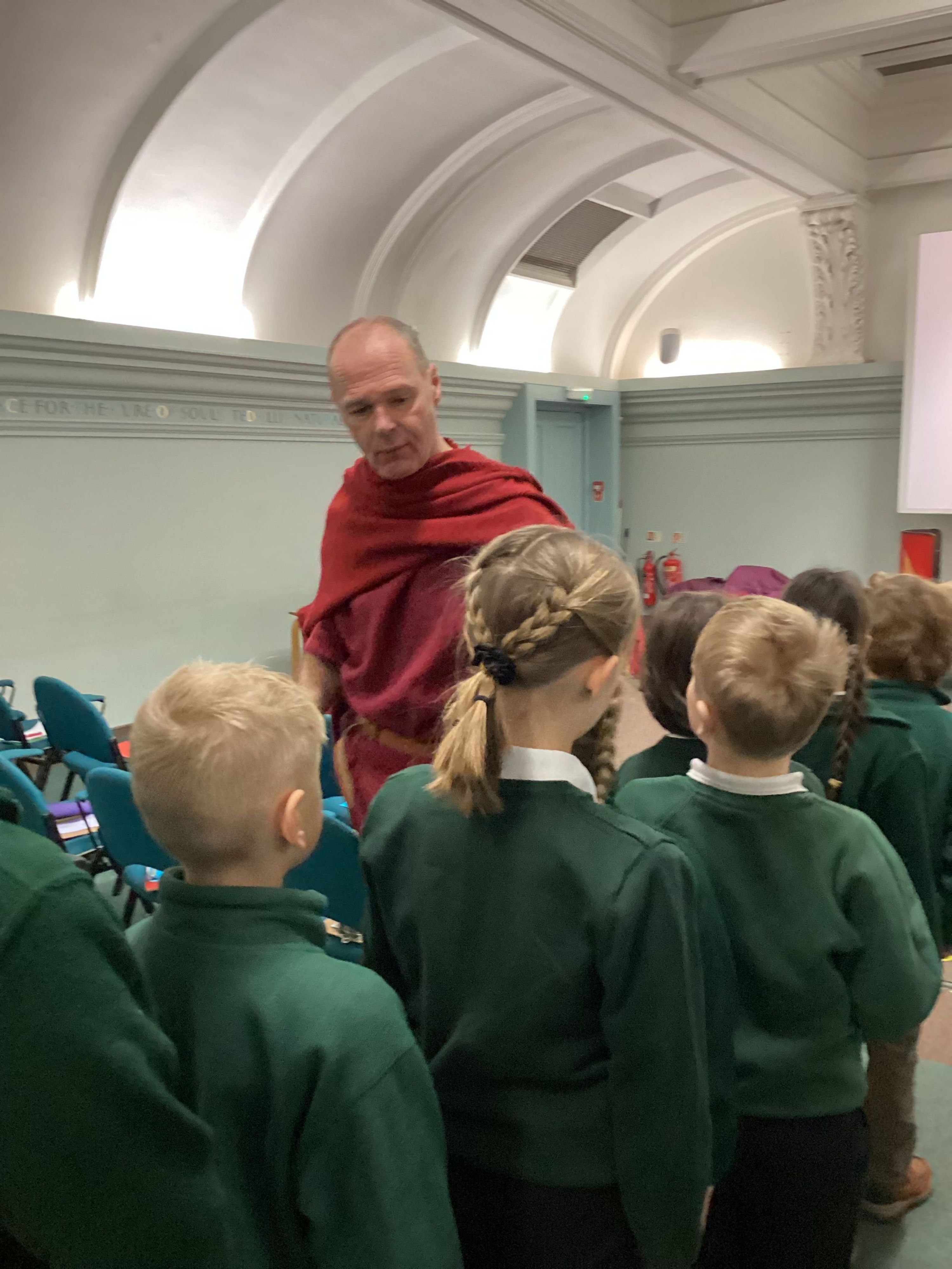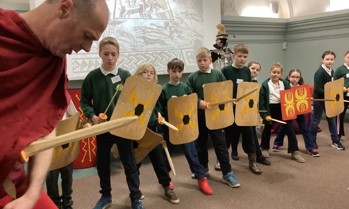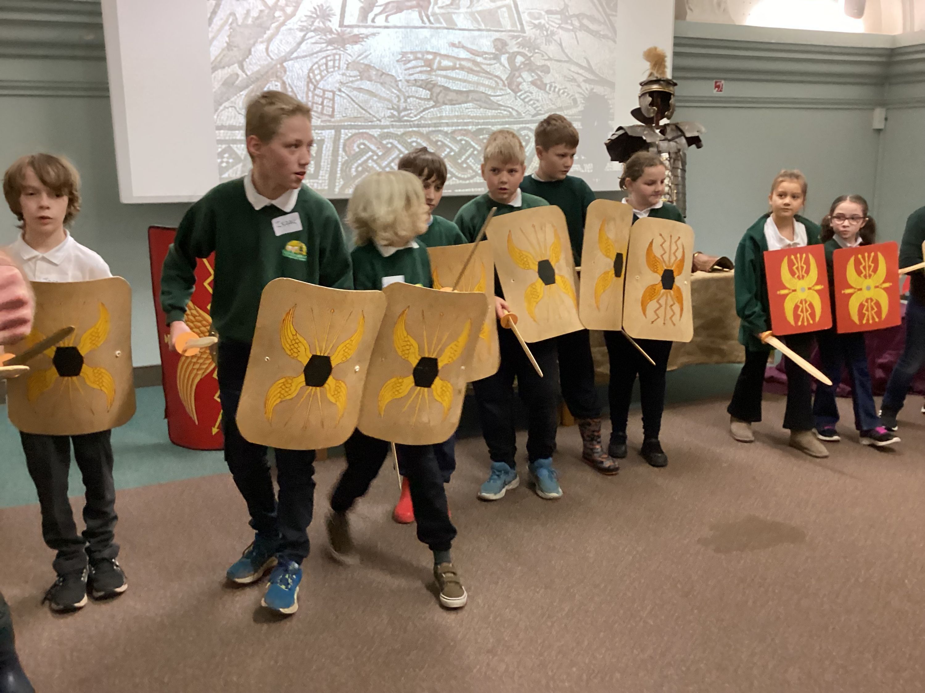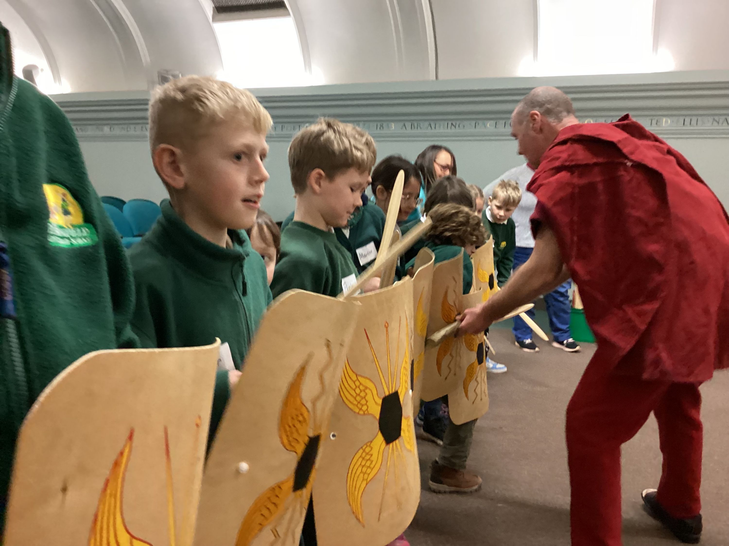 The morning was spent at Norwich Castle, where the children took part in a series of four engaging workshops that brought Roman Britain vividly to life. Our first workshop was led by a Roman centurion named Marcus, who introduced us to life as a Roman soldier. He shared examples of Roman weapons, armour and small personal items, carefully comparing them with those used by the Iceni. The children learned how the Iceni fought, lining up in two groups to practise their battle cries, before exploring the contrasting Roman approach to warfare. Marcus demonstrated how Roman soldiers were highly trained, fought in organised ranks, formed a shield wall and used controlled stabbing movements, all working together as a unit.