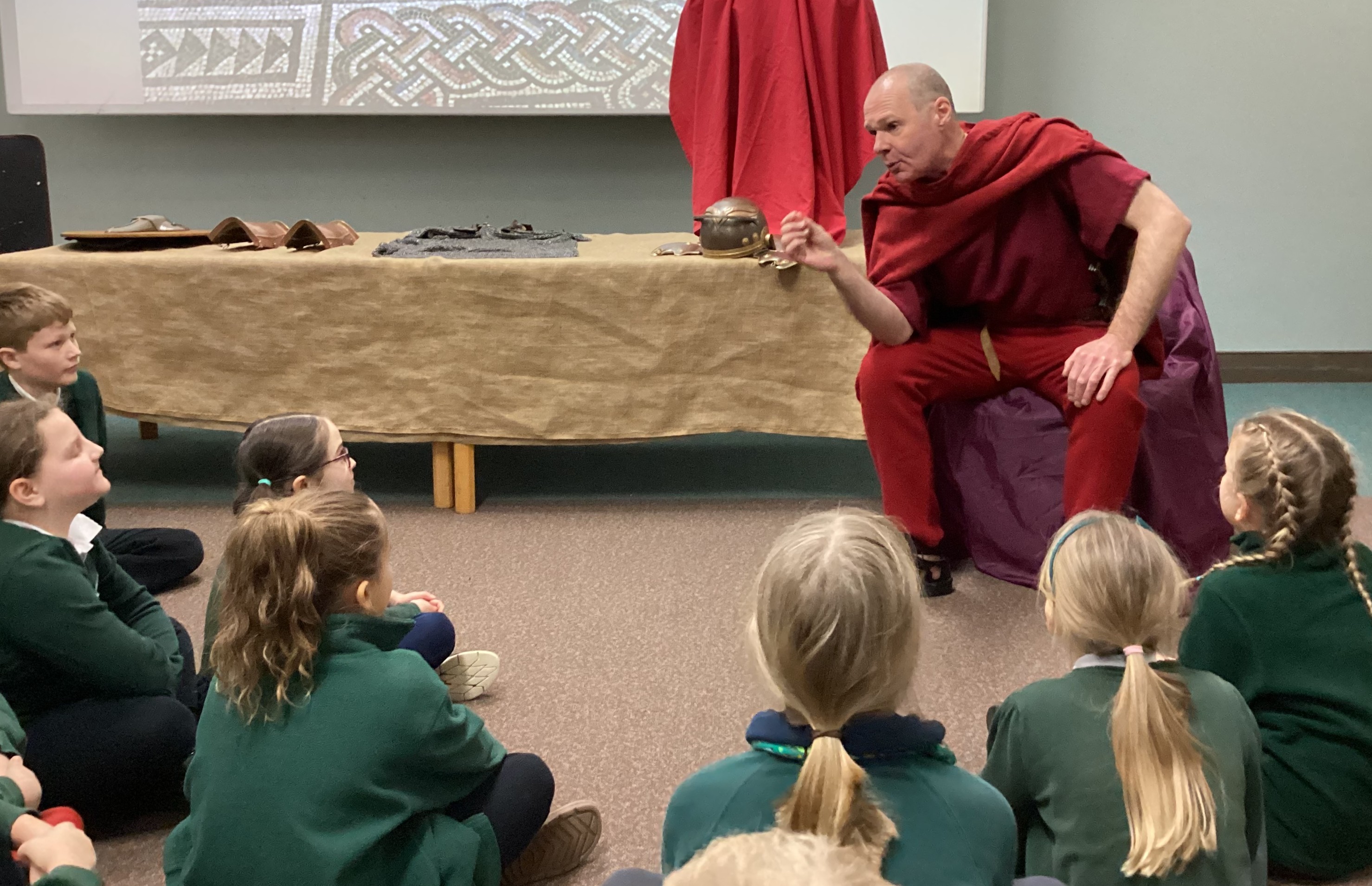 The second workshop was led by an Iceni woman, who compared Iceni and Roman homes. The children examined a range of artefacts, including Roman tiles, tesserae, samian ware and oil lamps, and discussed what these objects tell us about daily life, technology and comfort in Roman Britain.